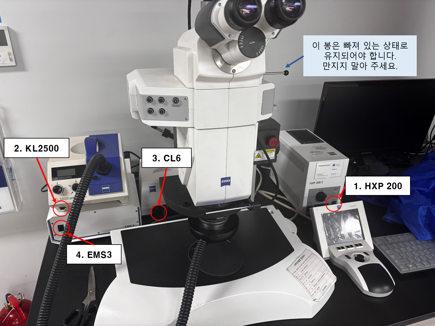 실체현미경(AXIO) 장비 사용 시 유의사항과 전원을 켜는 순서에 대해 안내 드립니다.